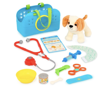 Turn into a veterinarian with the Happy Puppy Vet Set from Battat! This 11-piece vet kit encourages nurturing play thanks to its adorable plush pup and medical accessories. Does the puppy have a cold? Use the toy stethoscope to listen to the pups heartbeat! Got an ouchie? Apply the soft bandage. Also included is a pet cone, forceps, tweezers, a toy syringe, and a checklist for more vet play opportunities. Feeling better? Feed the dog the can of food and treat it to a bone. Then, put your plush pet into its carrier for adventures on the go! Playing with stuffed animals and medical toys sparks the imagination and encourages empathy.