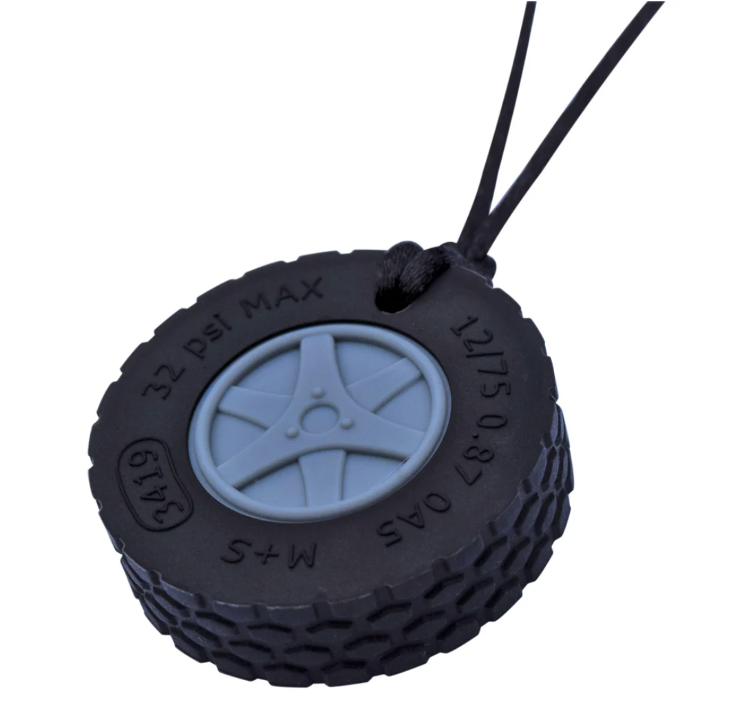 The Munchables Tire Chew Necklace was inspired by the LEGO tires. This chewelry features textured tread and an inset textured hubcap. It supports kids who chew shirts, sleeves, or fingers. Built for real-life chewing needs, it supports calmer days and fewer chewed-up clothes.